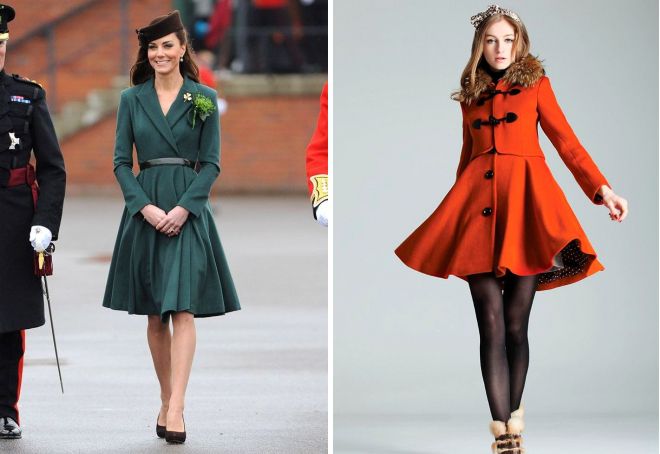 Полуприталенные и приталенные фасоны, расклешенные книзу, выгодно подчеркивают красоту линий фигуры типа X (Песочные Часы). Обладательницам типов фигур H (Прямоугольник) и V (Перевернутый Треугольник), которым хочется добавить объем в нижней части фигуры, также подойдут эти модели. Грушам такие модели тоже идут, но тут есть нюанс: если вы небольшого роста, линия талии должна быть чуточку завышена, и тогда хрупкий верх будет выгодно подчеркнут. Высоким женщинам стоит выбирать модели, в которых линия талии на своем месте или чуть занижена, — тогда пальто не будет выглядеть кукольным.