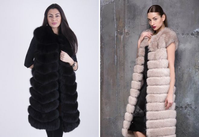 Но, тем не менее, именно длинные жилеты сейчас в тренде. Пышный серо-серебристый цвет ворса лисы в сочетании с длиной по колени, именно такие изделия сейчас в моде, и их можно встретить на первых модницах вашего города.
